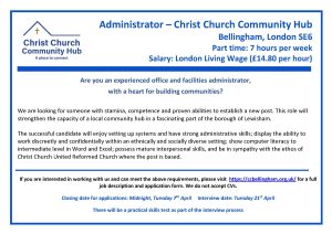 Job Opportunity: Administrator at Christ Church Community Hub Bellingham 16th March 2026 / Ross Furley-Smith / Jobs in Southern Synod / No Comments Job Opportunity: Administrator at Church Church Community Hub, Bellingham For more information about this exciting job opportunity, please click the following link; Could you be the Administrator we’re seeking? – Christ Church, Bellingham